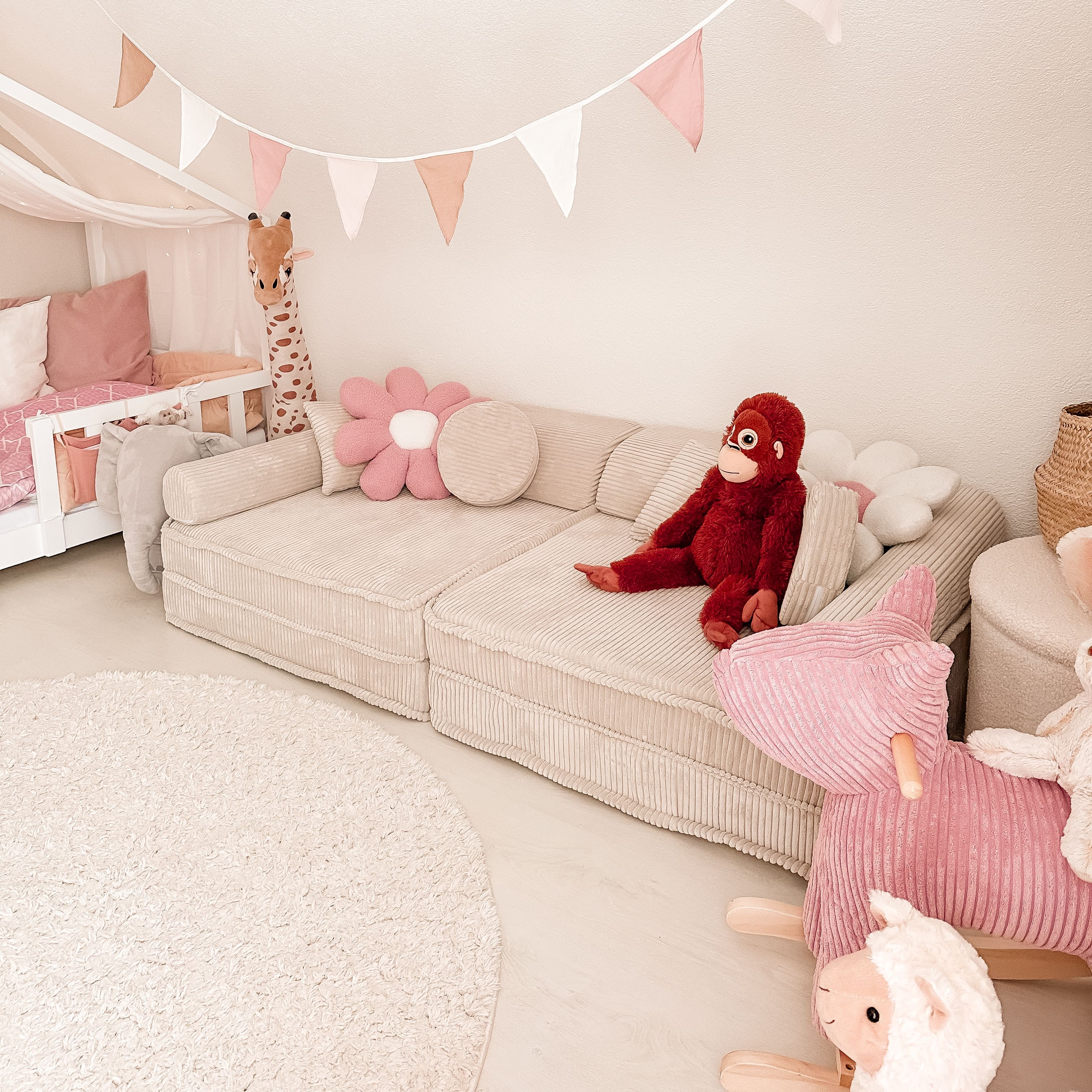 Die Oberflächen sind pflegeleicht, angenehm weich und sehen auch nach vielen Spielstunden noch gut aus. Besonders in Cord Beige entsteht ein ruhiger, harmonischer Look, der perfekt zu modernen Kinderzimmerideen passt. Und wenn mal etwas daneben geht? Kein Problem – die Bezüge lassen sich abnehmen und ganz einfach waschen.